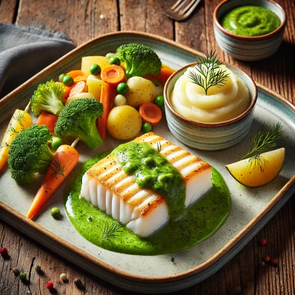 Cod Fillet with Dill Sauce and Potato Purée is a refined, delicate dish that combines the light, flaky texture of cod with the creamy richness of mashed potatoes and the freshness of dill sauce. The cod fillet is gently pan-seared or poached to preserve its tender, moist texture while maintaining its delicate flavor. The highlight of the dish is the dill sauce, made from fresh dill, a touch of cream, and a squeeze of lemon juice. The sauce perfectly complements the mild flavor of the cod, adding a bright, herbaceous note with a slight tang that elevates the entire meal. Served alongside the cod is a smooth, velvety potato purée, which is buttery and rich, offering a comforting and hearty contrast to the lightness of the fish. The presentation is elegant, with the cod fillet sitting atop a swirl of potato purée, drizzled with the vibrant green dill sauce and finished with a sprinkle of fresh herbs. This dish is a beautiful blend of simplicity and sophistication, providing a balanced and flavorful dining experience.