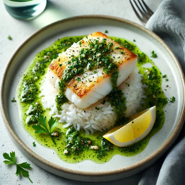 Enjoy a light yet flavorful dish featuring a tender cod fillet, perfectly complemented by a side of fluffy white rice. The fish is drizzled with gremolata sauce, a fresh blend of parsley, lemon zest, and garlic, which adds a bright and zesty layer to the meal. This dish combines mild, flaky fish with aromatic herbs and citrus for a balanced, refreshing taste that’s both elegant and wholesome. Ideal for those who appreciate the harmony of subtle flavors, this cod fillet with rice and gremolata is a delightful choice for any meal.