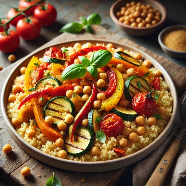 Enjoy our Couscous with Chickpeas and Roasted Vegetables, featuring fluffy couscous paired with tender chickpeas and a vibrant mix of roasted veggies. Drizzled with olive oil and sprinkled with herbs, this dish is a nutritious and flavorful option for any meal!