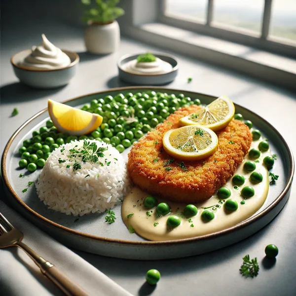 Crispy fish schnitzel served with creamy potato purée, sweet green peas, fluffy basmati rice, and aioli. Topped with fresh lemon slices and parsley for a bright, flavorful finish.