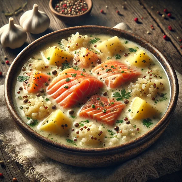 Fish Soup with Dill, Potatoes, and Quinoa is an elegantly crafted dish that offers a balance of nourishing ingredients and delicate flavors. Small, tender pieces of fish are gently simmered in a light broth, allowing the natural flavors of the fish to meld beautifully with the other components. Diced potatoes add heartiness to the soup, providing a soft and starchy texture that contrasts well with the lightness of the broth. The quinoa, scattered throughout the dish, offers a nutritious grainy bite, enriching the soup with a subtle earthiness. Fresh dill is sprinkled generously over the top, infusing the soup with a bright, herbal fragrance and adding an extra layer of depth to the overall flavor. The presentation is simple yet refined, with the various textures and colors coming together in perfect harmony.