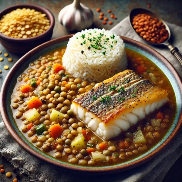 Enjoy a comforting lentil soup paired with tender cod fillets and fluffy basmati rice. This dish combines hearty flavors and textures, offering a nutritious and satisfying meal that warms the soul.