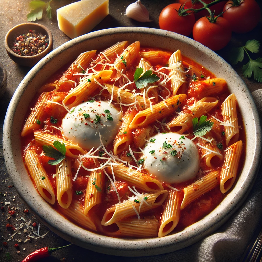 A flavorful pasta in tomato sauce with buffalo mozzarella, topped with Parmesan, fresh parsley, and a hint of chili. A delightful Italian-inspired meal.