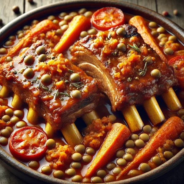 Pork Ribs Stewed with Lentils and Carrots is a comforting and hearty dish that brings together the rich flavors of tender pork and nutritious ingredients. The succulent pork ribs are simmered slowly until they become melt-in-your-mouth tender, infusing the stew with a deep, savory flavor.The addition of earthy lentils provides a hearty texture and protein boost, while the sweet, vibrant carrots add a pop of color and sweetness to the dish. Aromatic onions, garlic, and fragrant herbs like thyme and bay leaves enhance the overall depth of flavor, creating a warm, inviting aroma that fills your kitchen.This stew is perfect for cozy evenings, served alongside crusty bread or over a bed of rice, making it not just a meal, but a delightful experience that warms both body and soul.