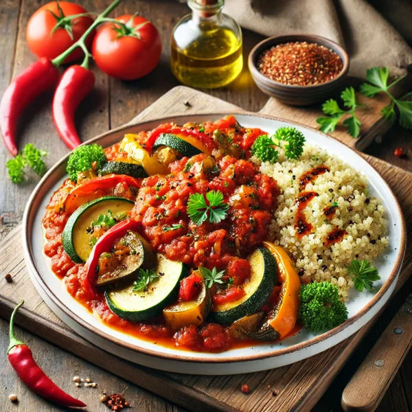 A flavorful mix of spicy ratatouille served with fluffy quinoa, enhanced by tomato sauce, chili flakes, and fresh parsley. A healthy, plant-based dish with a touch of heat.