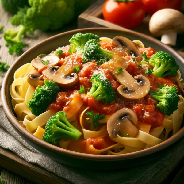 Tagliatelle with Mushrooms and Broccoli—a satisfying dish of al dente tagliatelle tossed with sautéed mushrooms, tender broccoli, and a light garlic-Parmesan sauce for a balanced and flavorful meal.