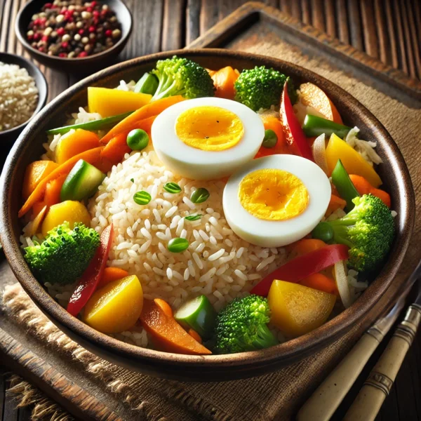 Asian Rice with Vegetables and Eggs—a vibrant dish of fluffy rice stir-fried with fresh vegetables and topped with soft scrambled eggs, seasoned with soy sauce and sesame oil for a balanced, flavorful meal.