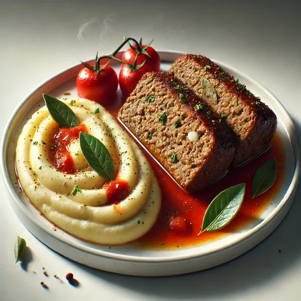 Relish our Beef Meatloaf with potato purée, a classic dish featuring seasoned beef meatloaf with herbs and Parmesan, served alongside creamy potato purée and a rich tomato and red wine sauce.