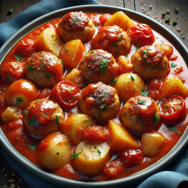 Enjoy our Chicken Meatballs with potatoes in tomato sauce, a comforting dish featuring tender chicken meatballs and potatoes in a creamy and flavorful tomato sauce.