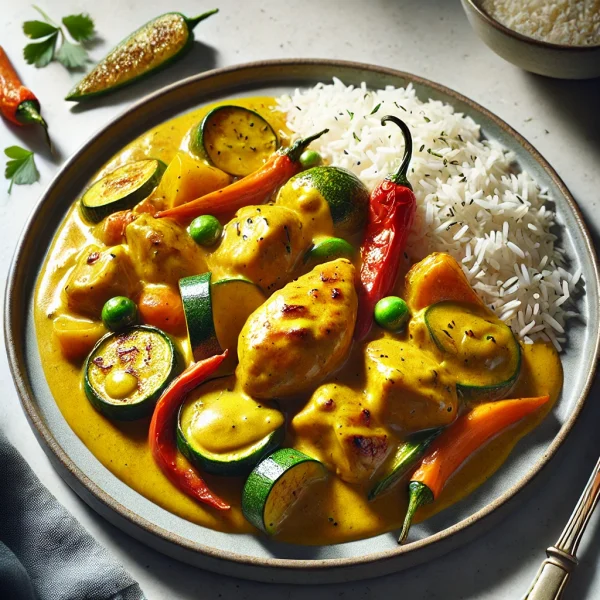 Njut av vår Kyckling med Currysås, Grönsaker och Ris, med saftig kyckling som sjudits i en rik currysås tillsammans med en blandning av färska grönsaker. Serverad över fluffigt ris, är denna rätt ett tröstande och smakrikt alternativ för alla måltider!