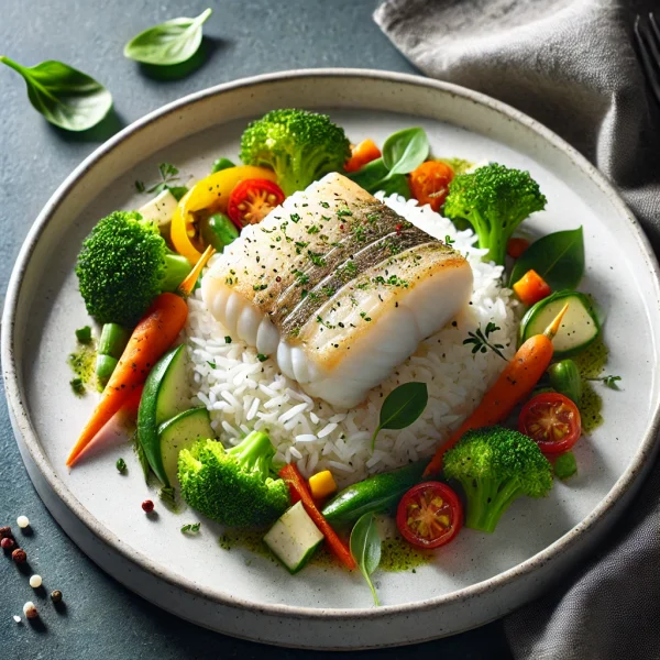Enjoy a light and nutritious meal featuring a tender cod fillet, served with fluffy rice and a colorful array of fresh vegetables, creating a beautifully balanced plate.