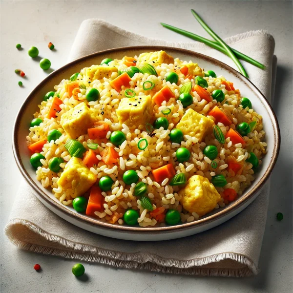 This egg fried rice dish features fluffy rice stir-fried with scrambled eggs and a colorful mix of vegetables, including carrots, peas, and bell peppers. Lightly seasoned with soy sauce and spices, the rice takes on a warm golden-brown color, blending savory flavors and textures. Garnished with fresh green onions, the dish is presented on a white plate, offering an inviting and appetizing meal that’s both nutritious and delicious.