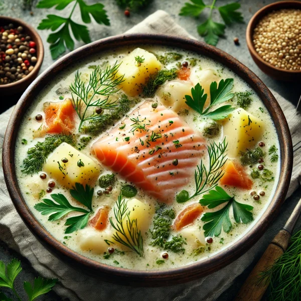 Njut av vår Fisksoppa med Potatis, Dill och Quinoa, en näringsrik och aromatisk rätt som förenar havets fräschör med mättande ingredienser. Denna soppa innehåller möra fiskbitar som långsamt sjuds i en smakrik buljong, berikad med färska örter och kryddor. Skivade potatisar tillför krämighet och stadga, medan dillen ger en ljus, örtig ton som lyfter rätten. Näringsrik quinoa bidrar med en härlig textur och ökar proteininnehållet, vilket gör soppan både mättande och hälsosam. Serverad varm är den perfekt som tröstande mat under kyliga dagar eller som en lätt måltid året runt. Garnerad med ett stänk färsk dill, är denna fisksoppa en utsökt hyllning till smaker och texturer.