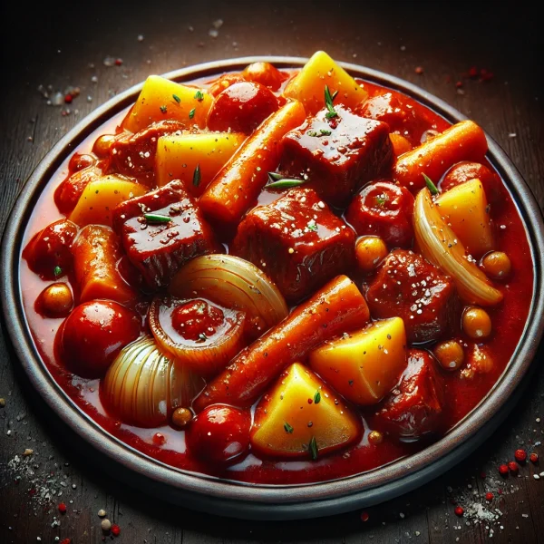 Savor our Goulash with potatoes, a hearty and flavorful stew featuring tender beef, potatoes, and carrots in a rich tomato and beef broth, seasoned with paprika and aromatic herbs.