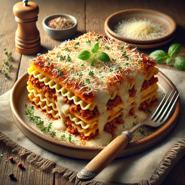 Lasagna Bolognese—a rich, comforting dish featuring layers of pasta, slow-cooked Bolognese sauce, creamy béchamel, and melted cheese for a hearty, indulgent meal.