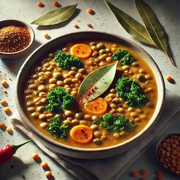 A hearty lentil soup with carrots, kale, and a hint of chili, blended with aromatic vegetables and olive oil for a nourishing, flavorful bowl.