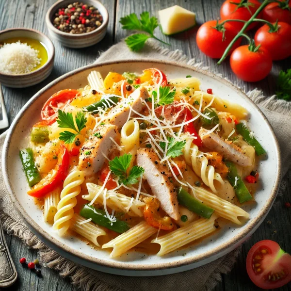 Creamy pasta with tender chicken fillet and a mix of peppers, tossed in a rich pepper-cream sauce with Parmesan and parsley. Served with a fresh mixed salad of tomatoes and cucumbers.