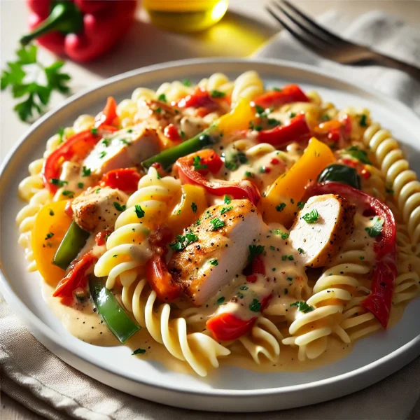 Pasta med Kyckling och Peppar i Gräddsås, en utsökt rätt som förenar saftig kyckling, al dente-pasta och en livfull blandning av blandade paprikor. Den krämiga såsen, infunderad med aromatiska örter och kryddor, omfamnar varje ingrediens och skapar en harmonisk balans av smaker. Färska röda, gula och gröna paprikor ger både färg och en lätt sötma, medan kycklingen ger ett tillfredsställande proteintillskott. Perfekt för en mysig middag eller en imponerande måltid för gäster, serveras rätten varm och garnerad med en skvätt nyriven parmesanost och ett stänk av persilja. Upplev en tröstande och läcker kulinarisk resa som är både mättande och tillfredsställande!