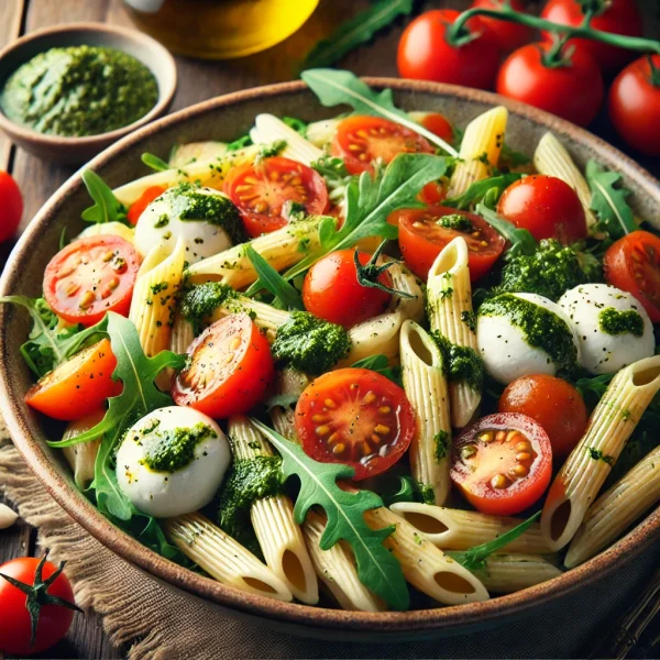 Pasta Salad with Mozzarella, Tomatoes, and Pesto is a vibrant and fresh dish that combines simple yet high-quality ingredients into a visually stunning and flavorful meal. Tender pasta serves as the base, offering a light and satisfying texture. The fresh mozzarella is cut into soft, creamy chunks that melt slightly, adding richness to the dish. Cherry tomatoes, halved to reveal their bright, juicy centers, introduce a pop of red color and a tangy sweetness. The highlight of the dish is the homemade pesto, made from fresh basil, garlic, pine nuts, and olive oil, generously drizzled over the salad. The pesto’s bold, herbaceous flavor complements the creamy mozzarella and tangy tomatoes, while the tender pasta ties everything together. The dish is elegantly presented on a clean white plate, making the colors and textures of the ingredients stand out, offering both a delicious and aesthetically pleasing dining experience.