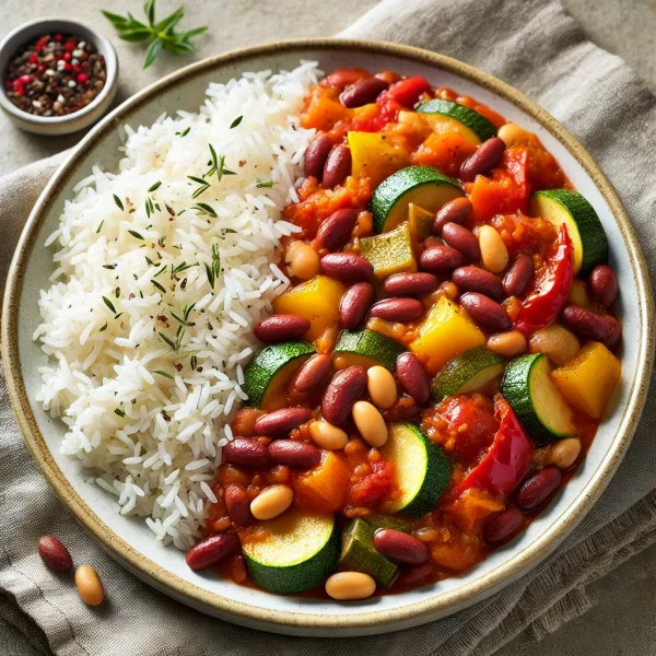Njut av vår Ratatouille med Vita Bönor och Basmatiris, med en färgstark blandning av färska grönsaker och krämiga vita bönor som sjudit i doftande örter. Serverad över fluffigt basmatiris, är denna rätt ett utsökt och näringsrikt alternativ för alla måltider!